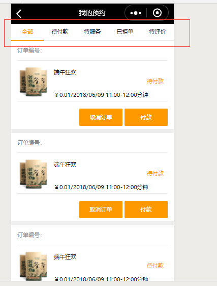 12.“用户中心”页面中有“我的预约”,点击之后,页面中会有订单的状态“待付款”、“待服务”“已拒单”“待评价”以及“全部”,点击都可以看到该状态下的订单内容: